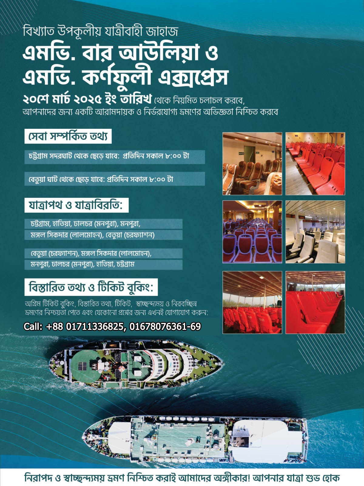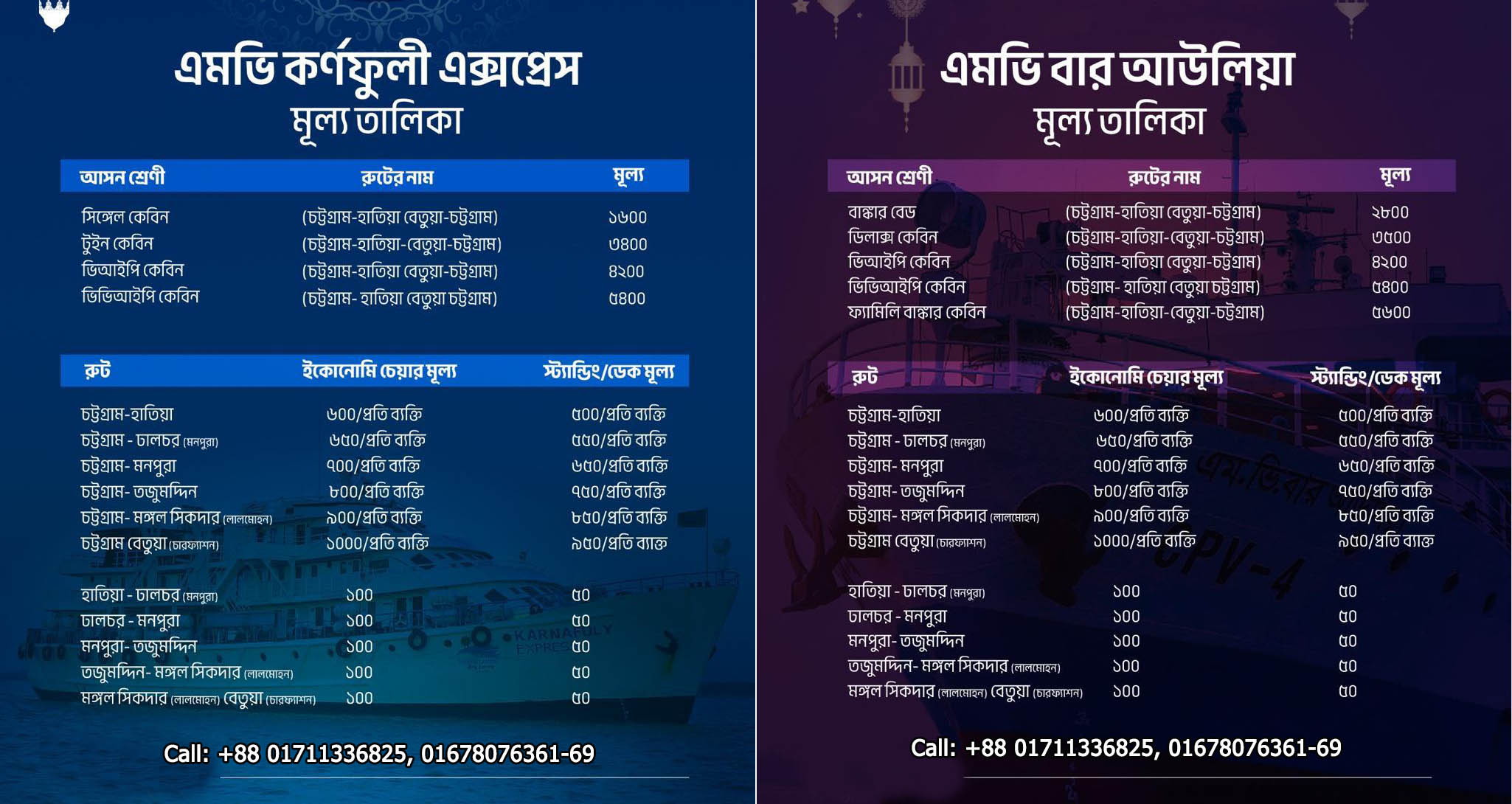 রিপোর্টিং ১ ঘন্টা আগে। *জোয়ার ভাটার কারণে জাহাজ ছাড়ার সময় পরিবর্তন হতে পারে।